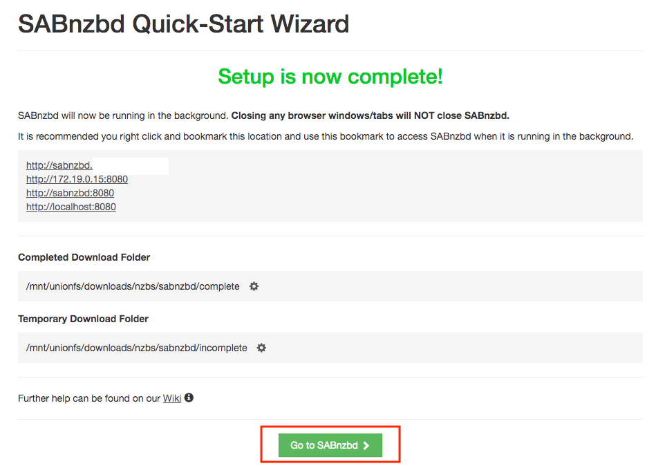 - When you get to the end of the wizard, click "Go To SABnzbd"
